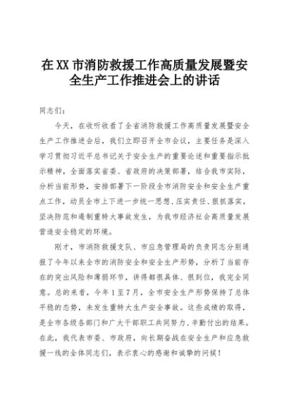 【七哥公文】2025年:在XX市消防救援工作高质量发展暨安全生产工作推进会上的讲话+更多免费公文+VX:QiGeGongWen2024
