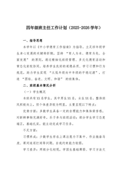 / 【七哥公文】2025年:四年级班主任工作计划(2025-2026学年)+更多免费公文+VX:QiGeGongWen2024