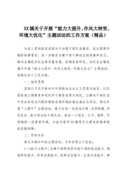 【七哥公文】2025年:XX镇关于开展“能力大提升、作风大转变、环境大优化”主题活动的工作方案(精品)+更多免费公文+VX:QiGeGongWen2024