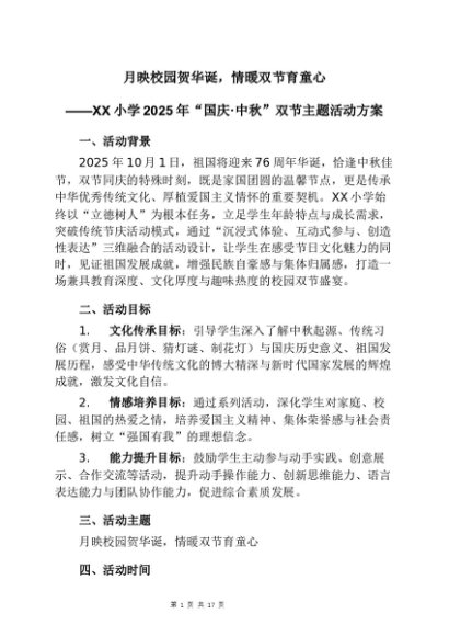 【七哥公文】2025年:XX小学2025年“国庆·中秋”双节主题活动方案:月映校园贺华诞,情暖双节育童心+更多免费公文+VX:QiGeGongWen2024