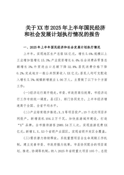 【七哥公文】2025年:关于XX市2025年上半年国民经济和社会发展计划执行情况的报告+更多免费公文+VX:QiGeGongWen2024