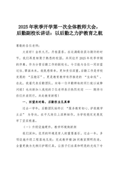 【七哥公文】2025年:2025年秋季开学第一次全体教师大会,后勤副校长讲话:以后勤之力护教育之航+更多免费公文+VX:QiGeGongWen2024
