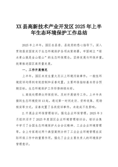 【七哥公文】2025年:XX县高新技术产业开发区2025年上半年生态环境保护工作总结+更多免费公文+VX:QiGeGongWen2024