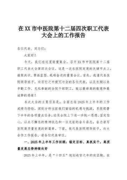 / 【七哥公文】2025年:在XX市中医院第十二届四次职工代表大会上的工作报告+更多免费公文+VX:QiGeGongWen2024