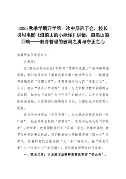 【七哥公文】2025年:2025秋季学期开学第一次中层班子会,校长引用电影《浪浪山的小妖怪》讲话:浪浪山的回响——教育管理的破局之勇与守正之心+更多免费公文+VX:QiGeGongWen2024