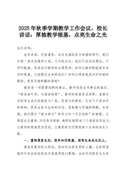 【七哥公文】2025年:2025年秋季学期教学工作会议,校长讲话:厚植教学根基,点亮生命之光+更多免费公文+VX:QiGeGongWen2024