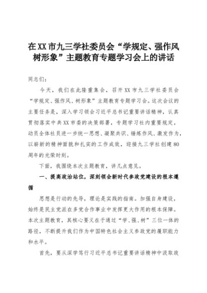 【七哥公文】2025年:在XX市九三学社委员会“学规定、强作风、树形象”主题教育专题学习会上的讲话+更多免费公文+VX:QiGeGongWen2024