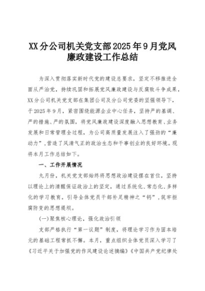 【七哥公文】2025年:XX分公司机关党支部2025年9月党风廉政建设工作总结+更多免费公文+VX:QiGeGongWen2024