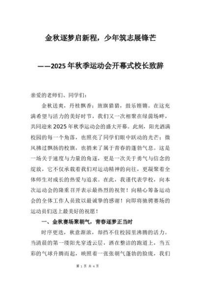 【七哥公文】2025年:2025年秋季运动会开幕式校长致辞:金秋逐梦启新程,少年筑志展锋芒+更多免费公文+VX:QiGeGongWen2024