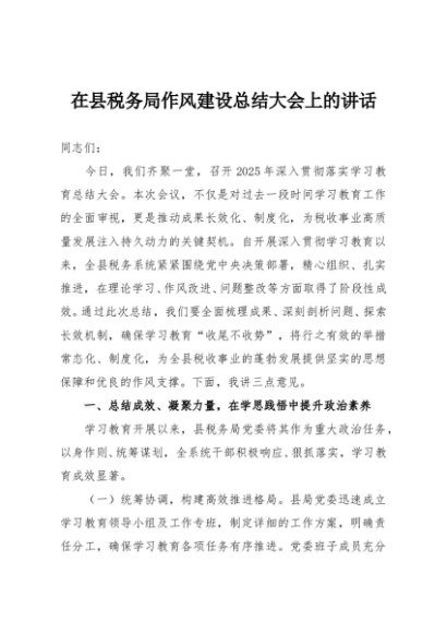 / 【七哥公文】2025年:在县税务局作风建设总结大会上的讲话+更多免费公文+VX:QiGeGongWen2024