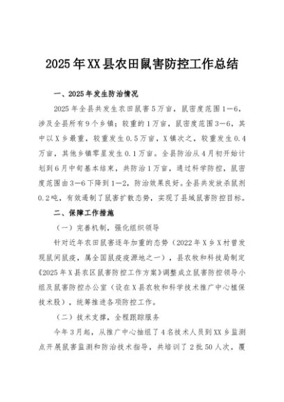 / 【七哥公文】2025年:2025年XX县农田鼠害防控工作总结+更多免费公文+VX:QiGeGongWen2024