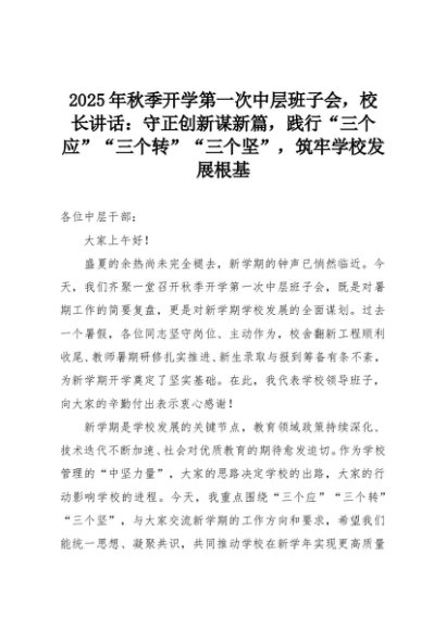 【七哥公文】2025年:2025年秋季开学第一次中层班子会,校长讲话:守正创新谋新篇,践行“三个应”“三个转”“三个坚”,筑牢学校发展根基+更多免费公文+VX:QiGeGongWen2024