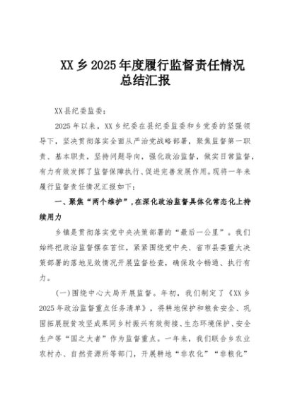 / 【七哥公文】2025年:XX乡2025年度履行监督责任情况总结汇报+更多免费公文+VX:QiGeGongWen2024