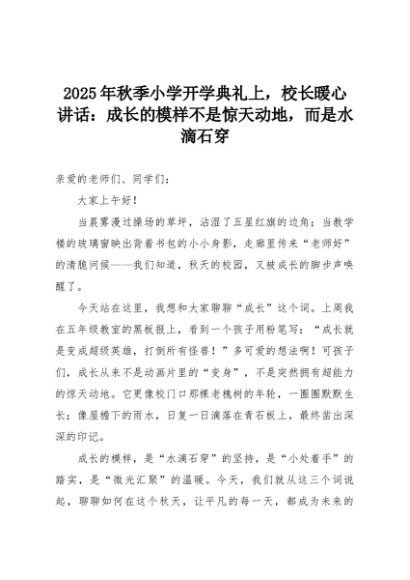【七哥公文】2025年:2025年秋季小学开学典礼上,校长暖心讲话:成长的模样不是惊天动地,而是水滴石穿+更多免费公文+VX:QiGeGongWen2024