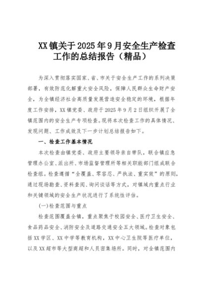 【七哥公文】2025年:XX镇关于2025年9月安全生产检查工作的总结报告(精品)+更多免费公文+VX:QiGeGongWen2024