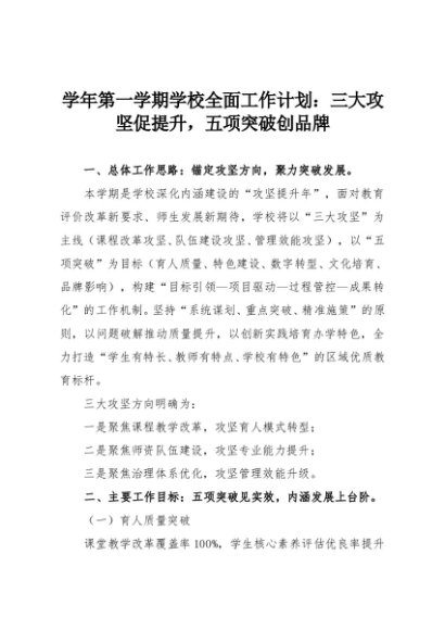 【七哥公文】2025年:学年第一学期学校全面工作计划:三大攻坚促提升,五项突破创品牌+更多免费公文+VX:QiGeGongWen2024
