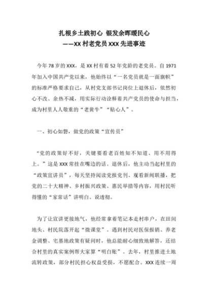 【七哥公文】2025年:扎根乡土践初心 银发余晖暖民心 ——XX村老党员XXX先进事迹+更多免费公文+VX:QiGeGongWen2024