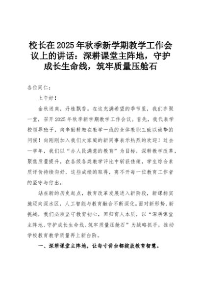 【七哥公文】2025年:校长在2025年秋季新学期教学工作会议上的讲话:深耕课堂主阵地,守护成长生命线,筑牢质量压舱石+更多免费公文+VX:QiGeGongWen2024
