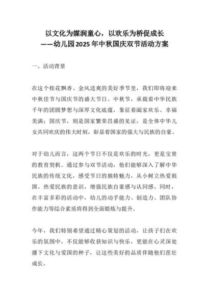 【七哥公文】2025年:以文化为媒润童心,以欢乐为桥促成长——幼儿园2025年中秋国庆双节活动方案+更多免费公文+VX:QiGeGongWen2024