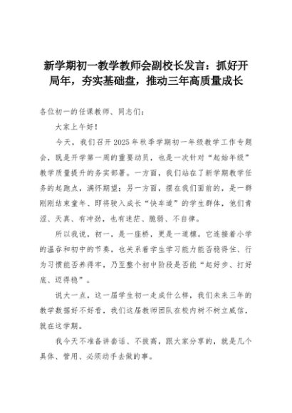 【七哥公文】2025年:新学期初一教学教师会副校长发言:抓好开局年,夯实基础盘,推动三年高质量成长+更多免费公文+VX:QiGeGongWen2024
