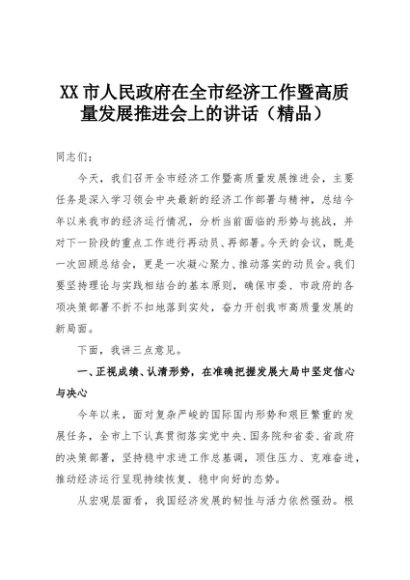 【七哥公文】2025年:XX市人民政府在全市经济工作暨高质量发展推进会上的讲话(精品)+更多免费公文+VX:QiGeGongWen2024