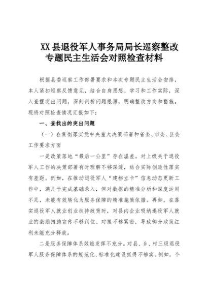 【七哥公文】2025年:XX县退役军人事务局局长巡察整改专题民主生活会对照检查材料+更多免费公文+VX:QiGeGongWen2024