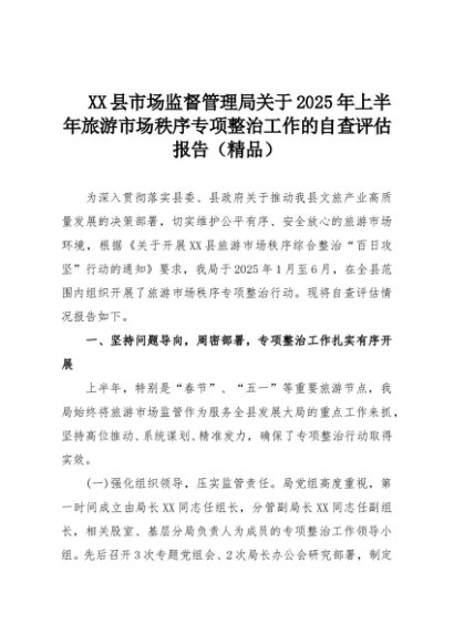 【七哥公文】2025年:XX县市场监督管理局关于2025年上半年旅游市场秩序专项整治工作的自查评估报告(精品)+更多免费公文+VX:QiGeGongWen2024