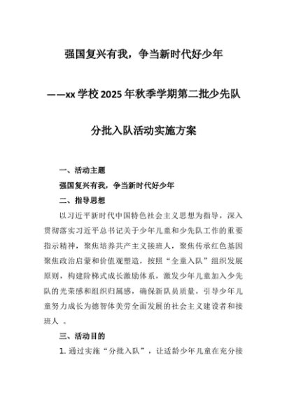 【七哥公文】2025年:xx学校2025年秋季学期第二批少先队分批入队活动实施方案:强国复兴有我,争当新时代好少年+更多免费公文+VX:QiGeGongWen2024