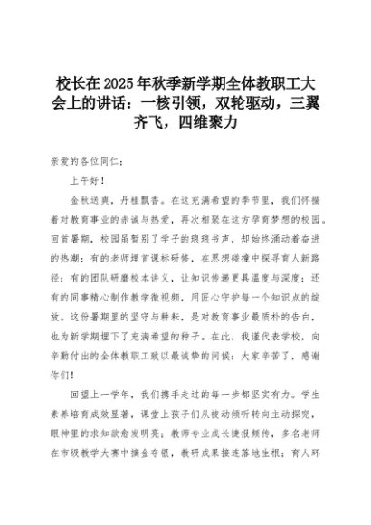 【七哥公文】2025年:校长在2025年秋季新学期全体教职工大会上的讲话:一核引领,双轮驱动,三翼齐飞,四维聚力+更多免费公文+VX:QiGeGongWen2024