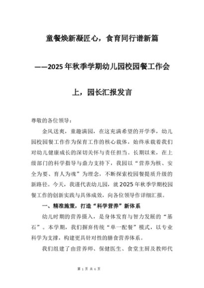【七哥公文】2025年:2025年秋季学期幼儿园校园餐工作会上,园长汇报发言:童餐焕新凝匠心,食育同行谱新篇+更多免费公文+VX:QiGeGongWen2024