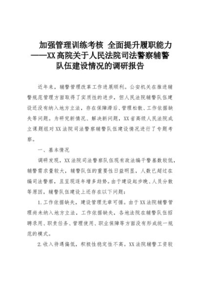 【七哥公文】2025年:加强管理训练考核 全面提升履职能力——XX高院关于人民法院司法警察辅警队伍建设情况的调研报告+更多免费公文+VX:QiGeGongWen2024
