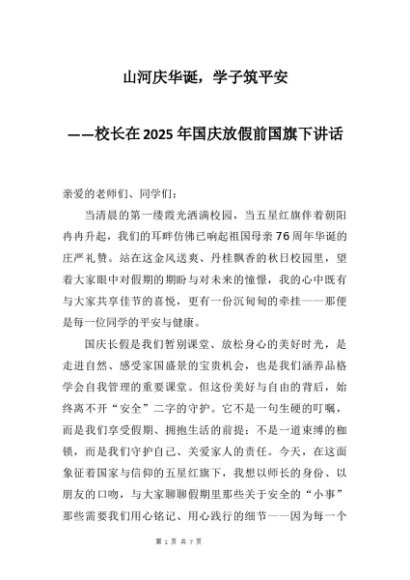 【七哥公文】2025年:校长在2025年国庆放假前国旗下讲话:山河庆华诞,学子筑平安+更多免费公文+VX:QiGeGongWen2024