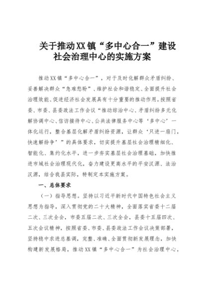 【七哥公文】2025年:关于推动XX镇“多中心合一”建设社会治理中心的实施方案+更多免费公文+VX:QiGeGongWen2024