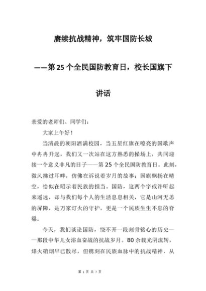 【七哥公文】2025年:第25个全民国防教育日,校长国旗下讲话:赓续抗战精神,筑牢国防长城+更多免费公文+VX:QiGeGongWen2024