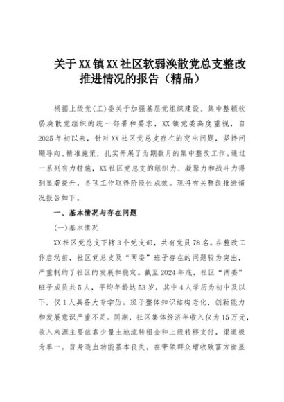 【七哥公文】2025年:关于XX镇XX社区软弱涣散党总支整改推进情况的报告(精品)+更多免费公文+VX:QiGeGongWen2024