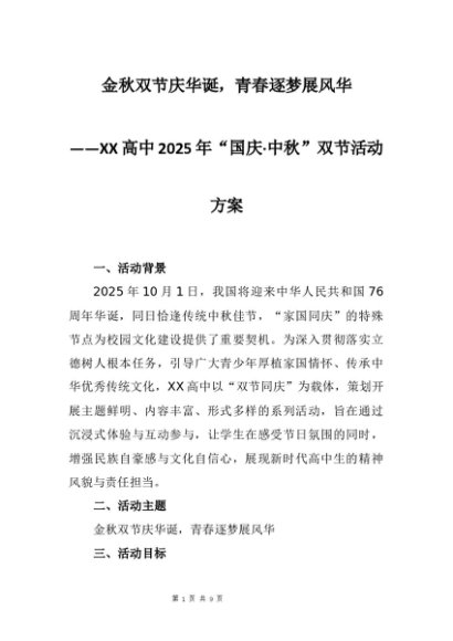 【七哥公文】2025年:XX高中2025年“国庆·中秋”双节活动方案:金秋双节庆华诞,青春逐梦展风华+更多免费公文+VX:QiGeGongWen2024