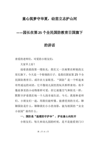 【七哥公文】2025年:园长在第25个全民国防教育日国旗下的讲话:童心筑梦守华夏,幼苗立志护山河+更多免费公文+VX:QiGeGongWen2024