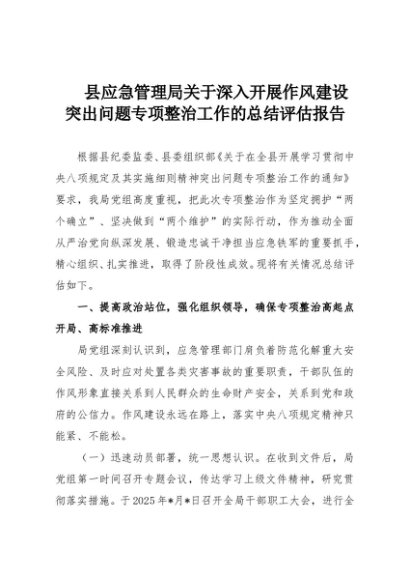 【七哥公文】2025年:县应急管理局关于深入开展作风建设突出问题专项整治工作的总结评估报告+更多免费公文+VX:QiGeGongWen2024