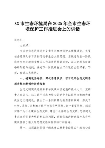 【七哥公文】2025年:XX市生态环境局在2025年全市生态环境保护工作推进会上的讲话+更多免费公文+VX:QiGeGongWen2024