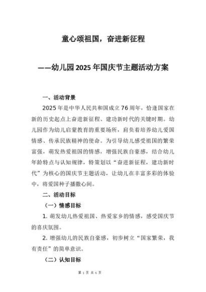 【七哥公文】2025年:幼儿园2025年国庆节主题活动方案:童心颂祖国,奋进新征程+更多免费公文+VX:QiGeGongWen2024