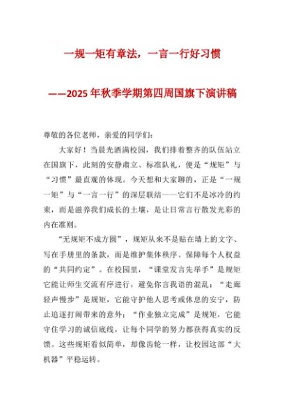 【七哥公文】2025年:2025年秋季学期第四周国旗下演讲稿:一规一矩有章法,一言一行好习惯+更多免费公文+VX:QiGeGongWen2024