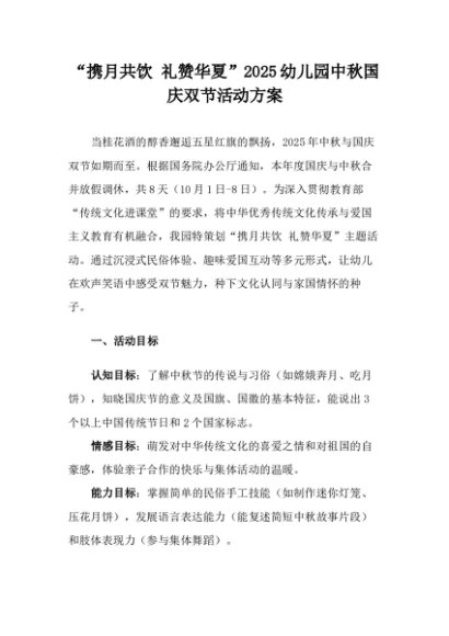 【七哥公文】2025年:“携月共饮 礼赞华夏”2025幼儿园中秋国庆双节活动方案+更多免费公文+VX:QiGeGongWen2024