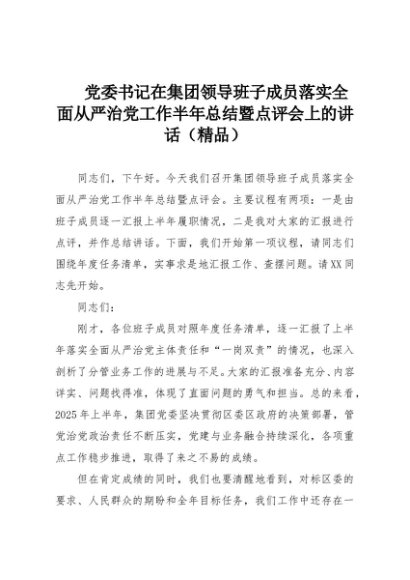 【七哥公文】2025年:党委书记在集团领导班子成员落实全面从严治党工作半年总结暨点评会上的讲话(精品)+更多免费公文+VX:QiGeGongWen2024