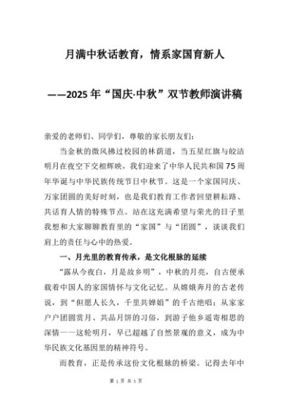 【七哥公文】2025年:2025年“国庆·中秋”双节教师演讲稿:月满中秋话教育,情系家国育新人+更多免费公文+VX:QiGeGongWen2024