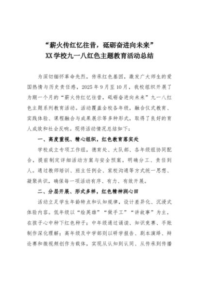 【七哥公文】2025年:“薪火传红忆往昔,砥砺奋进向未来“XX学校九一八红色主题教育活动总结+更多免费公文+VX:QiGeGongWen2024