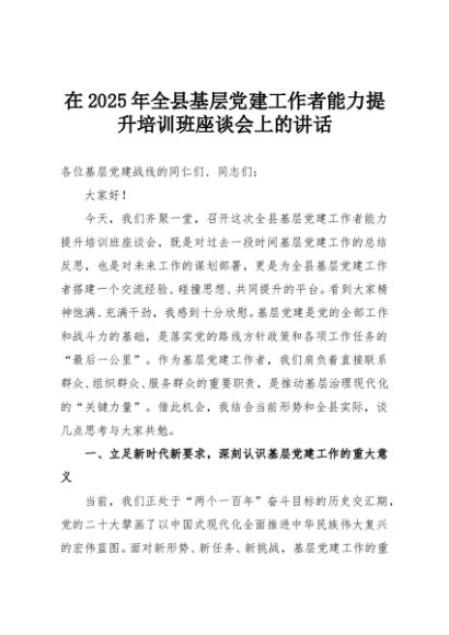 【七哥公文】2025年:在2025年全县基层党建工作者能力提升培训班座谈会上的讲话+更多免费公文+VX:QiGeGongWen2024