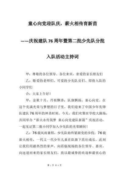 【七哥公文】2025年:庆祝建队76周年暨第二批少先队分批入队活动主持词:童心向党迎队庆,薪火相传育新苗+更多免费公文+VX:QiGeGongWen2024