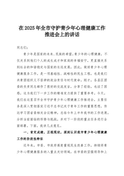 / 【七哥公文】2025年:在2025年全市守护青少年心理健康工作推进会上的讲话+更多免费公文+VX:QiGeGongWen2024