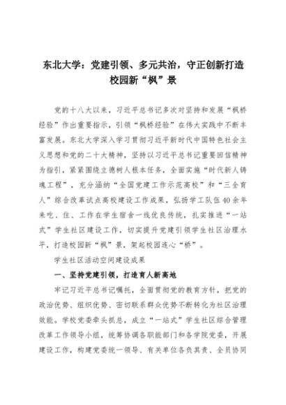 【七哥公文】2025年:东北大学:党建引领、多元共治,守正创新打造校园新“枫”景+更多免费公文+VX:QiGeGongWen2024