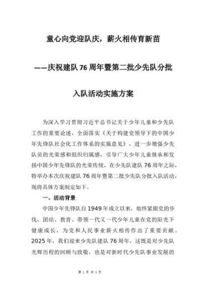 【七哥公文】2025年:庆祝建队76周年暨第二批少先队分批入队活动实施方案:童心向党迎队庆,薪火相传育新苗+更多免费公文+VX:QiGeGongWen2024